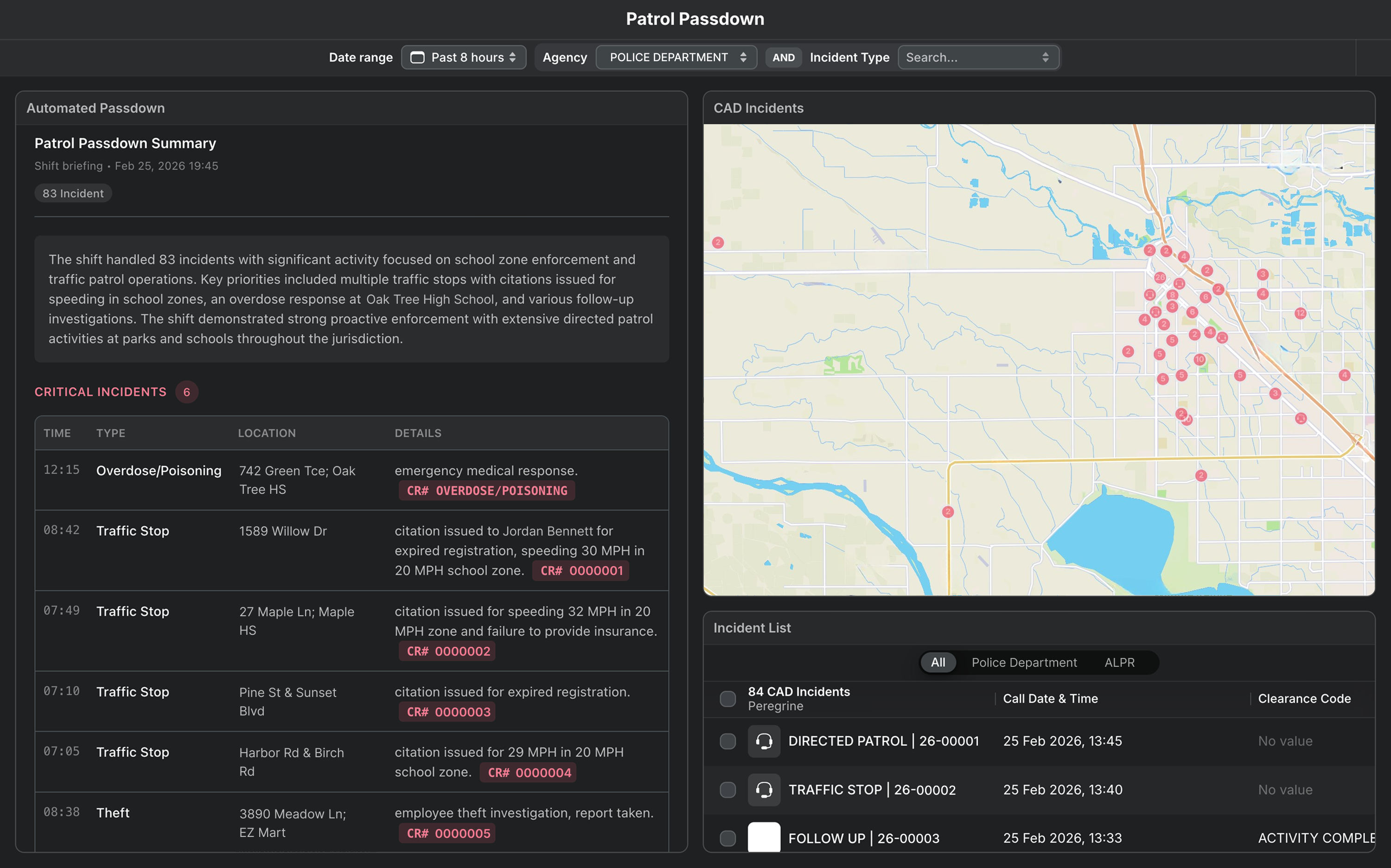 | End-of-shift reporting workflow | 1. Recall critical incidents and activity from shift 2. Log into multiple information systems to retrieve incident and activity notes 3. Manually type out end-of-shift report 4. Send end-of-shift report to command staff and incoming patrol shift | 1. Set desired date or time range 2. Instantly generate patrol passdown dashboard illustrating critical incidents and CAD activity 3. Click into specific incidents as needed to view granular details 4. Share patrol passdown report directly in Peregrine or via your agency’s preferred channel |